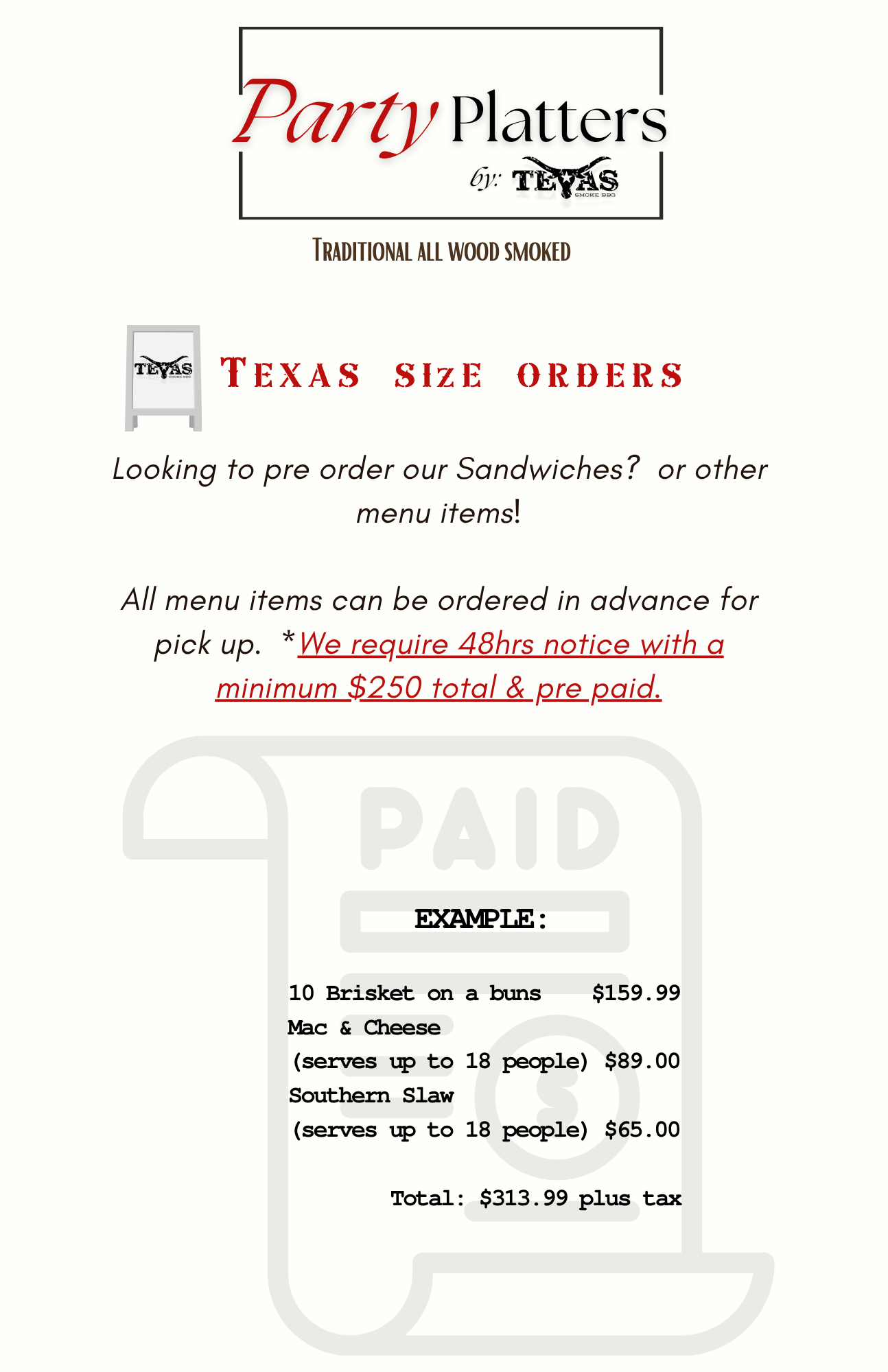 Our catering team will send you an estimate or invoice - at this time we tentatively hold the smoker space for you. Once paid you will be 100% confirmed for your order, location and time for pick up.